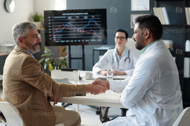 Бизнесмен пожимает руку улыбающемуся ближневосточному врачу