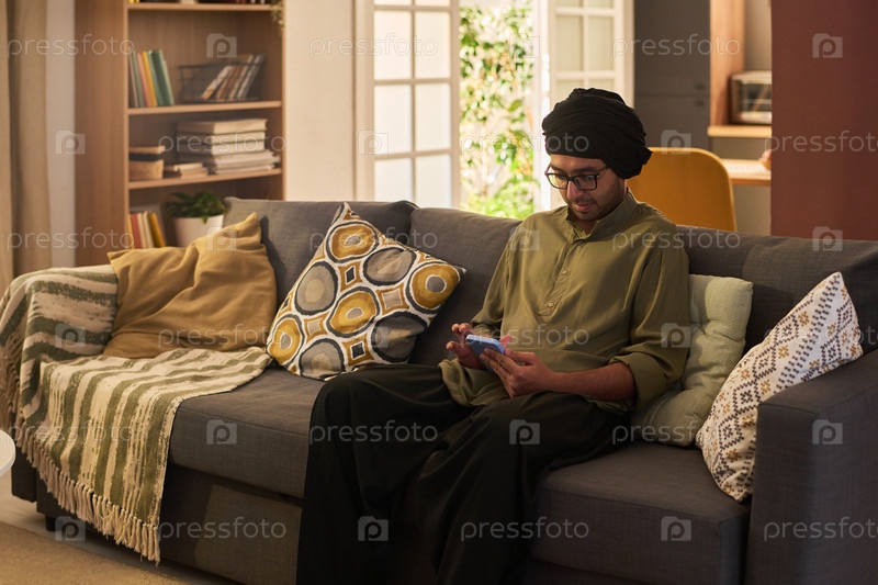 Сидеть на диване, держа смартфон в руках и писать мужчине смс