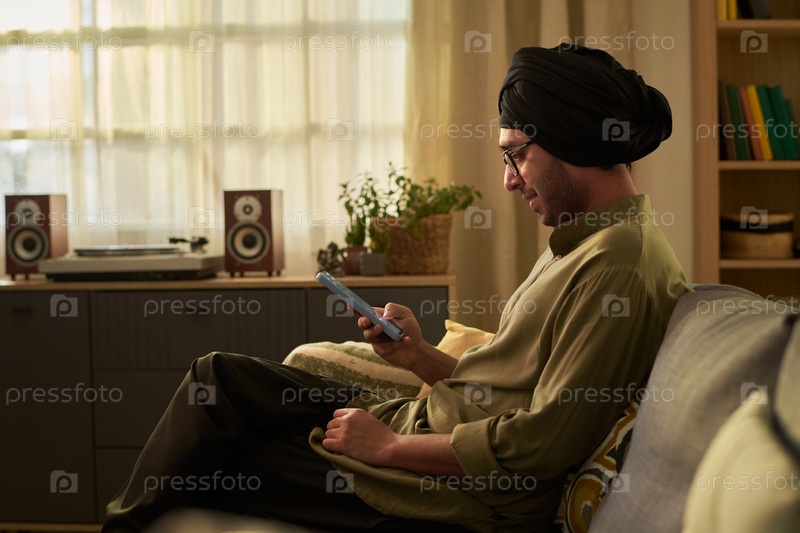 Мужчина в тюрбане, сидящий и использующий смартфон