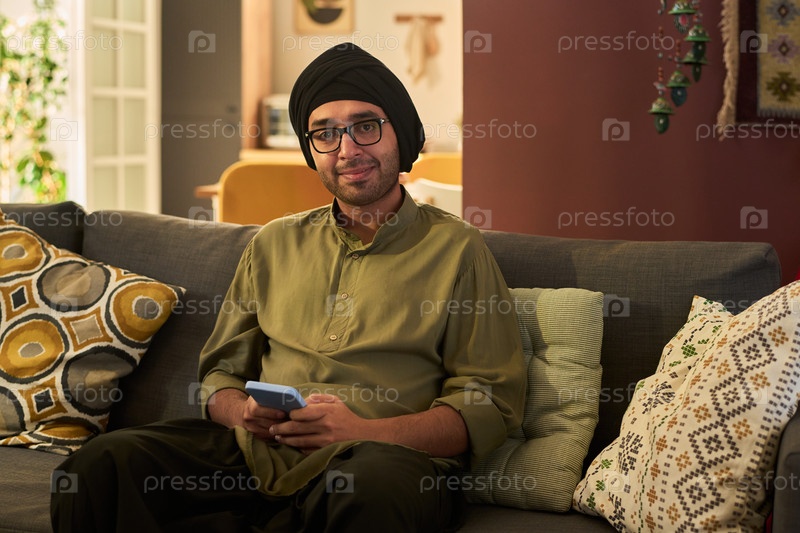 Портрет молодого человека, отдыхающего дома и держащего смартфон