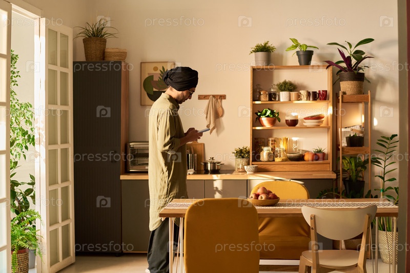 Человек, читающий телефон в яркой хорошо оформленной кухне