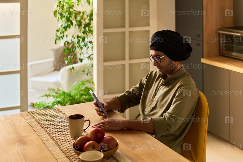 Молодой человек в тюрбане сидит за кухонным столом, читая планшет