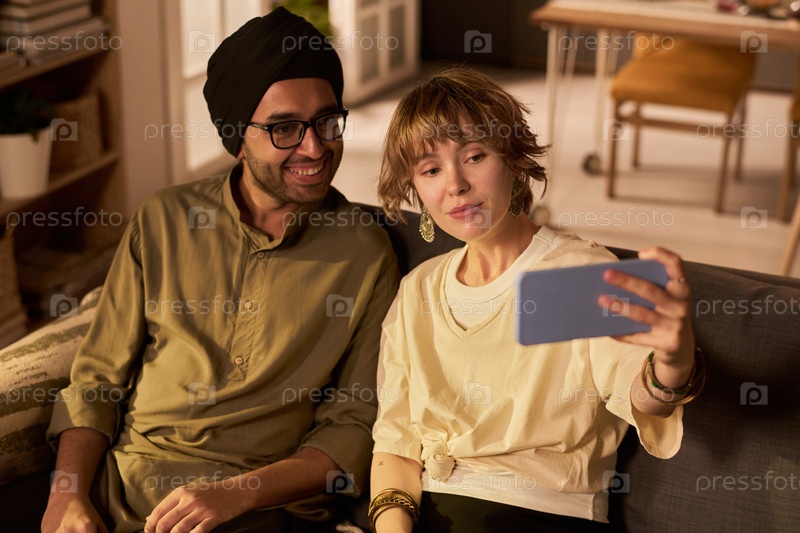 Улыбающаяся пара делает селфи дома вместе