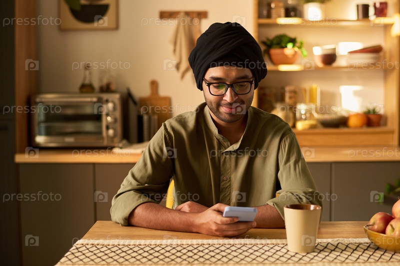 Улыбающийся мужчина проверяет телефон в уютной кухонной обстановке