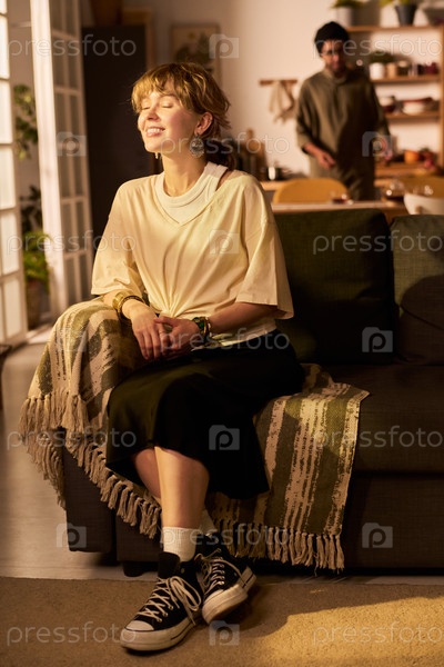 Улыбающаяся женщина сидит на диване в уютной гостиной