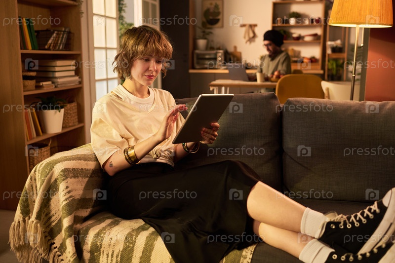 Расслабление на диване при использовании цифрового планшета