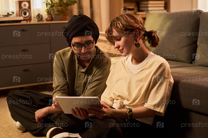 Взаимодействие с планшетом вместе в уютной помещенной обстановке