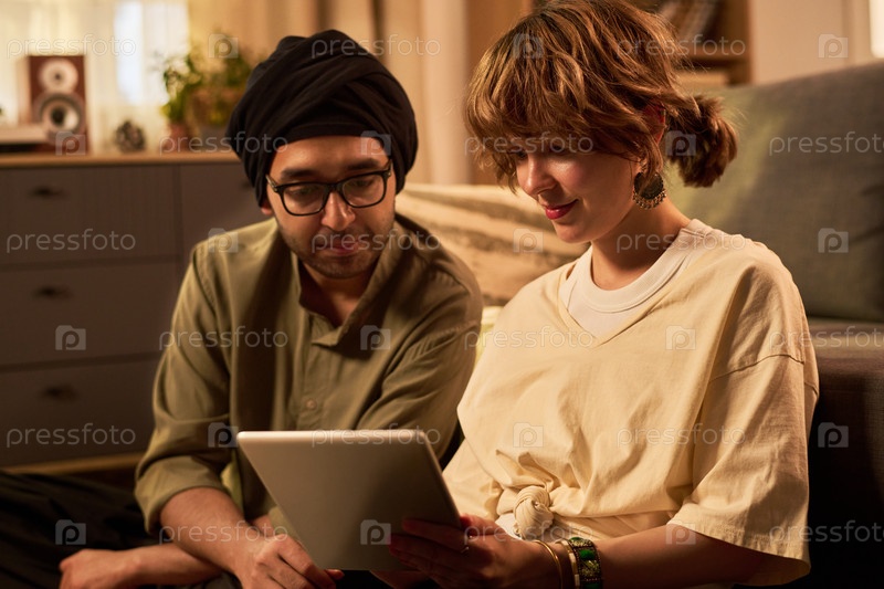 Два человека, взаимодействующие с электронным устройством в уютной комнате