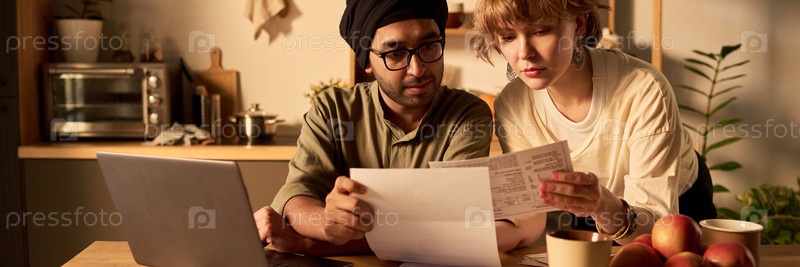 Просмотр финансовых документов в уютной домашней кухне