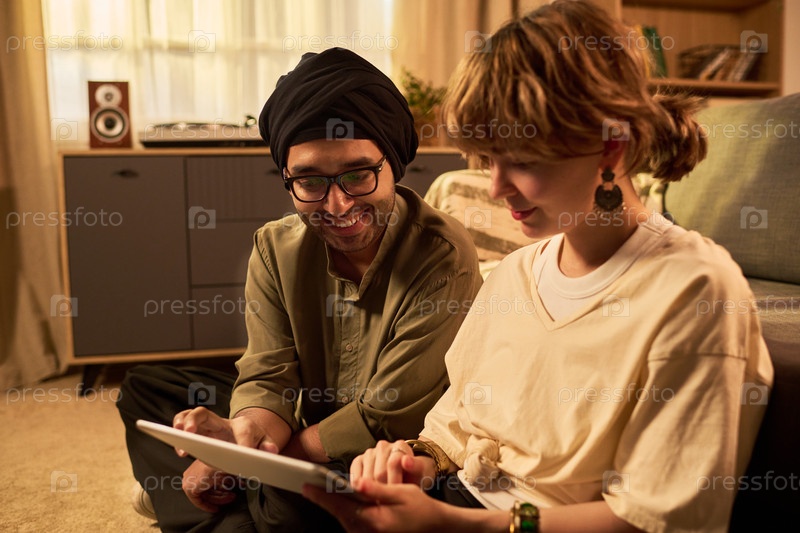 Два человека сидят вместе и смотрят на экран планшета