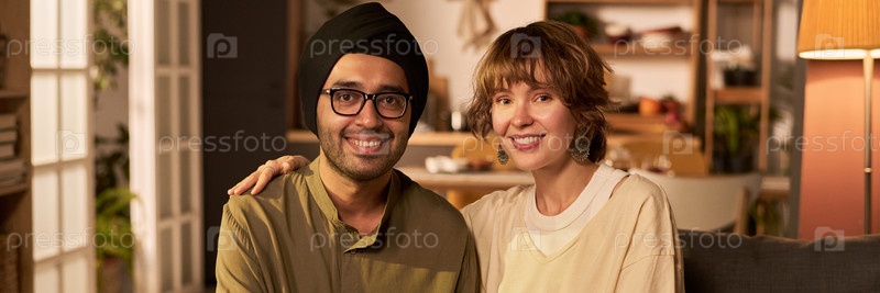 Портрет улыбающейся многорасовой пары, сидящей вместе в помещении