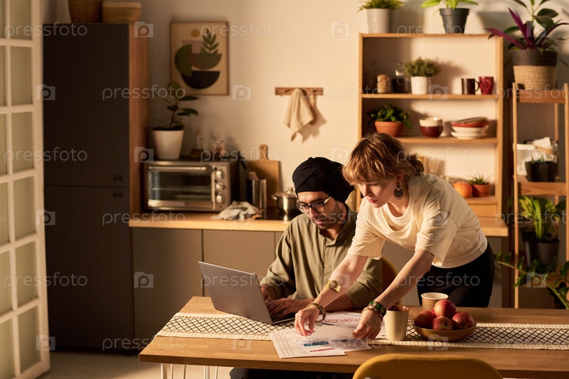 Сотрудничество над проектом в современном домашнем кухонном пространстве