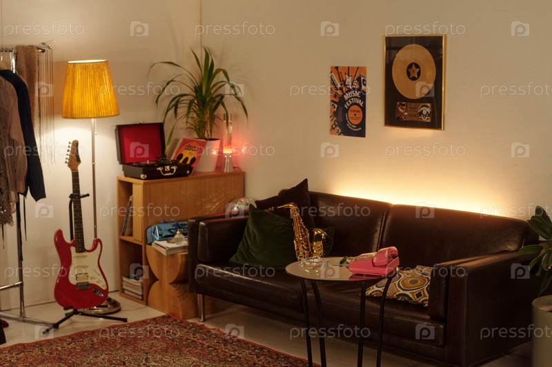 Винтажная гостиная с музыкальными инструментами и декором