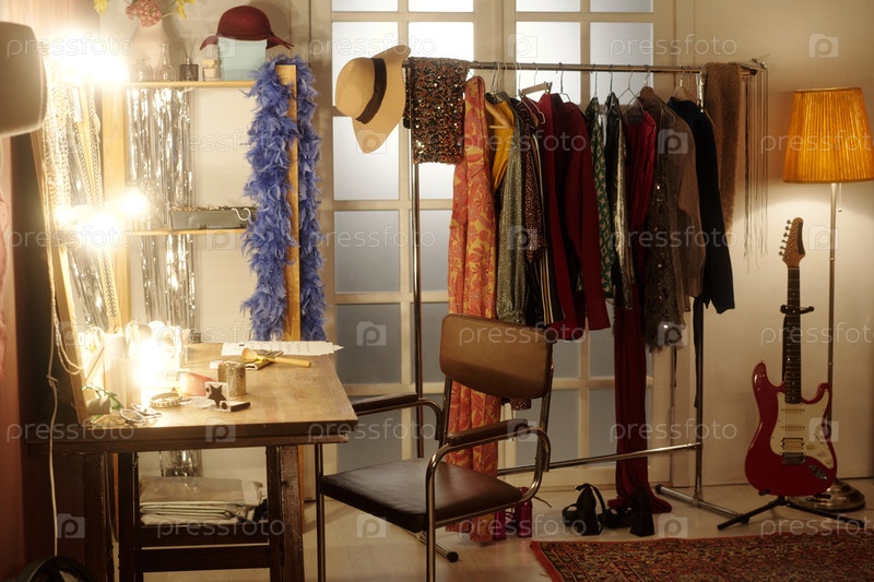 Студия моды с висящими платьями и зеркалом для одежды
