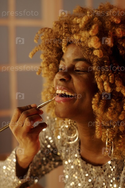 Улыбающаяся женщина с кудрявыми волосами использует косметическую кисть