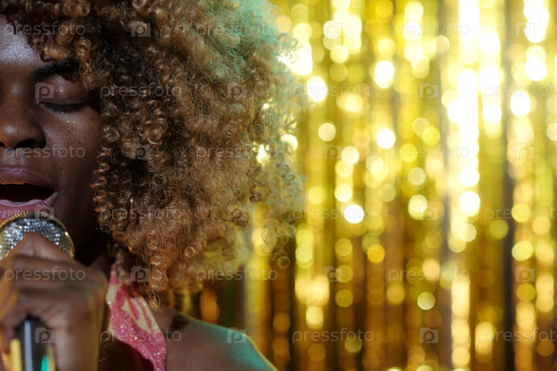 Петь афроамериканскую женщину с кудрявыми волосами на сцене