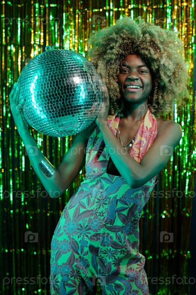 Улыбающаяся женщина позирует с дискотечным мячом в ярком наряде
