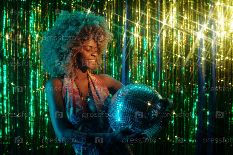 Празднование с диско-балом и зеленым ленточным фоном