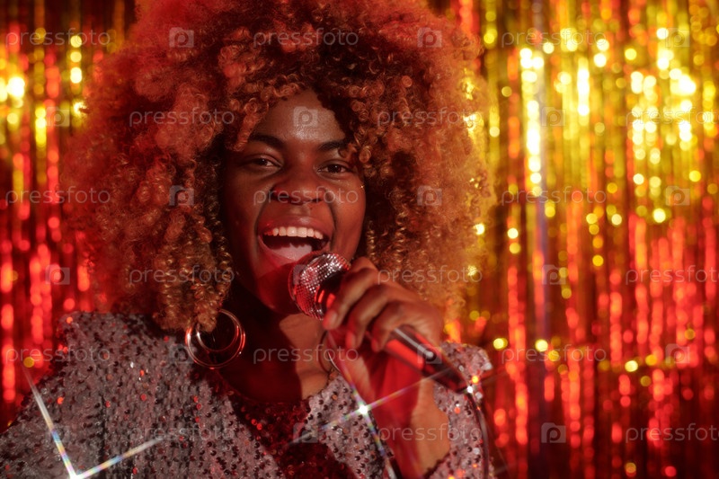 Певчая женщина, держащая микрофон со сверкающим фоном
