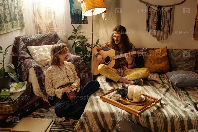 Сидя в винтажной комнате и играя вместе на акустической гитаре