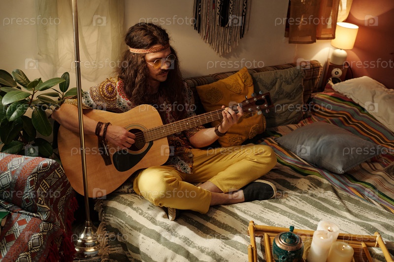 Человек играет на акустической гитаре, сидя в постели