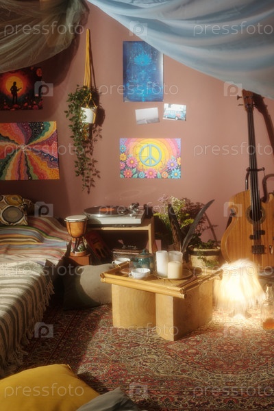 Уютная богемная спальня с художественным декором и гитарой