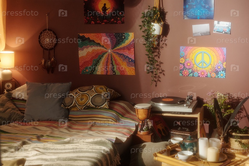 Уютная спальня с богемными украшениями и произведениями искусства