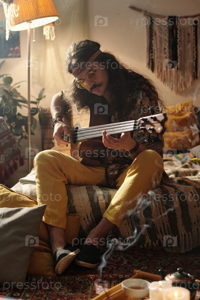 Играя на гитаре в уютной, богемно-вдохновленной гостиной