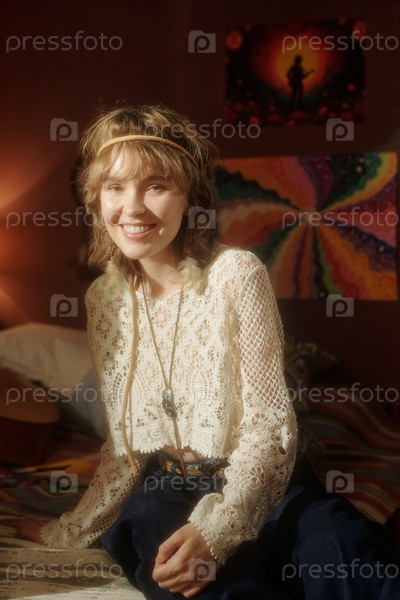 Улыбающаяся женщина сидит на кровати с красочными картинами