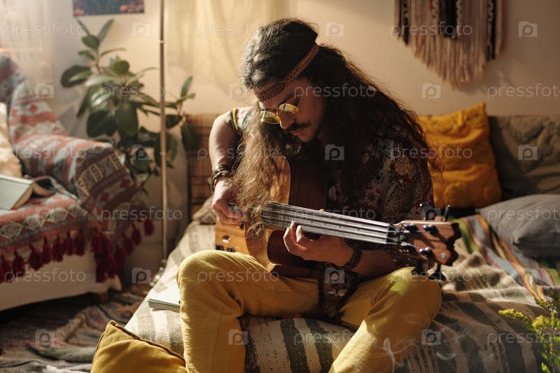 Играя на акустической гитаре в уютной обстановке гостиной