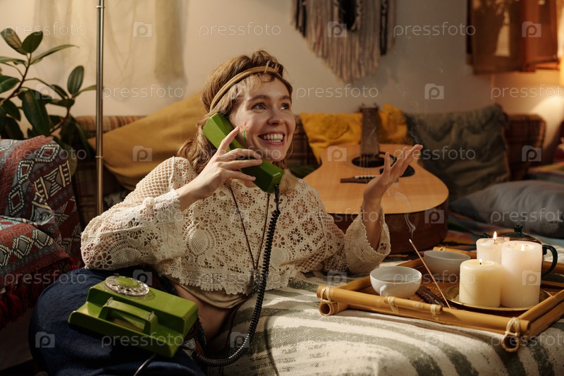 Улыбающаяся женщина разговаривает на зеленом ротационном телефоне дома