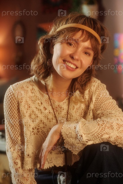Улыбающаяся женщина отдыхает в уютном помещении