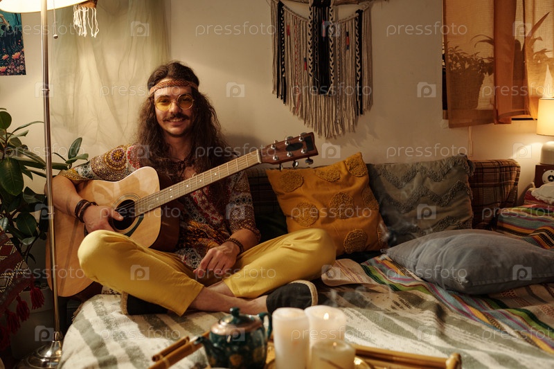 Улыбающийся молодой человек играет на акустической гитаре в уютной комнате
