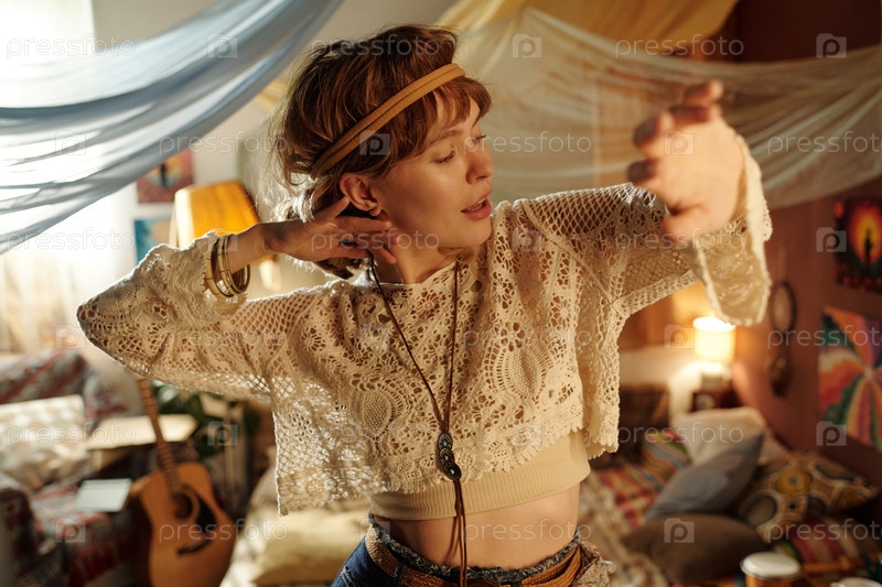 Настройка наушников в уютной комнате с красочными шторами