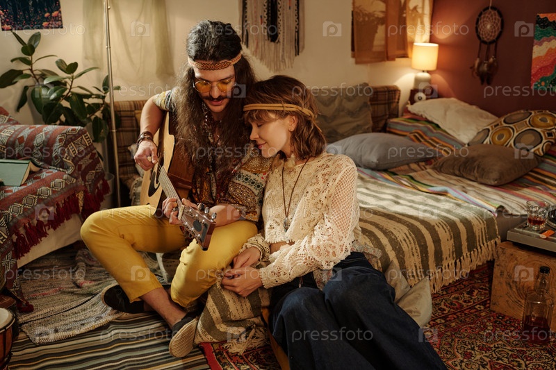Пара наслаждается музыкой дома, сидя вместе