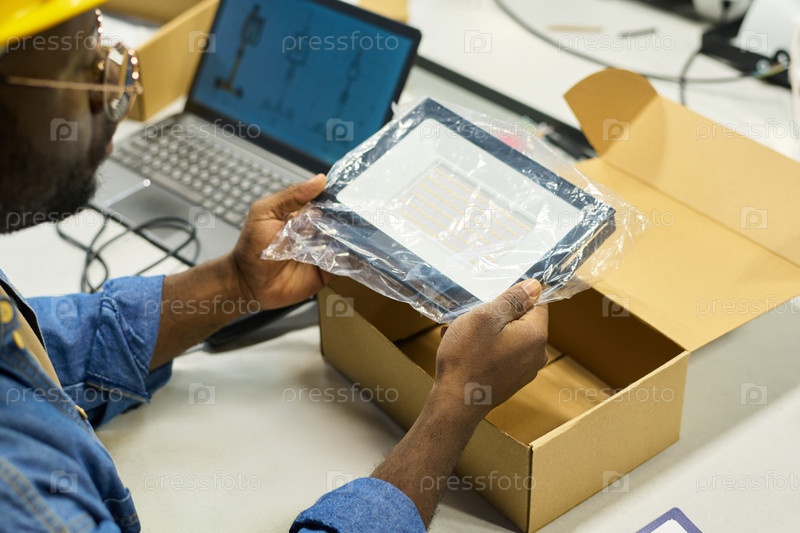 Держите новый электрический элемент над открытой коробкой