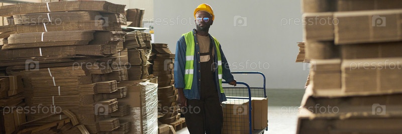 Мужчина тянет тележку с упакованными коробками