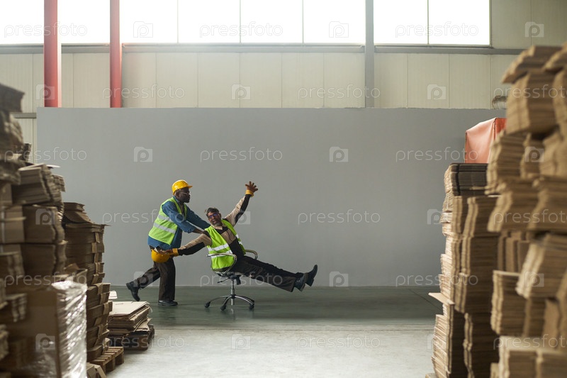 Счастливые инженеры веселятся на складе