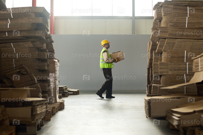 Человек между стоками картоновых листов