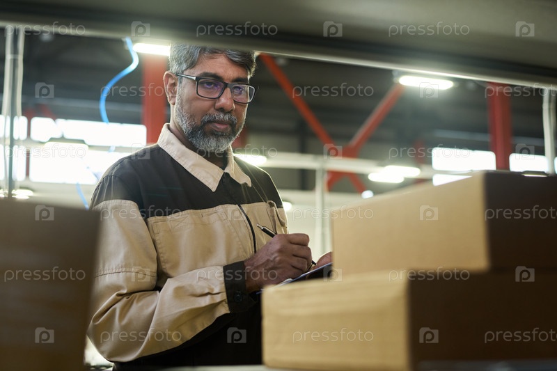Мужчина смотрит на наклейку в картонной коробке