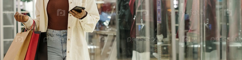 Женская покупательница отправляет текстовые сообщения на смартфоне