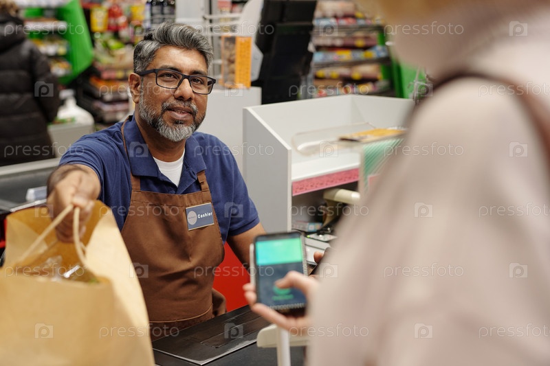 Кассир, помогающий индийскому клиенту