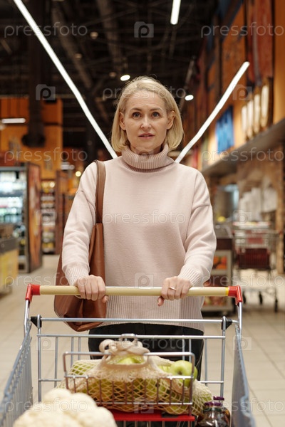 Женщина, толкающая корзину в магазине