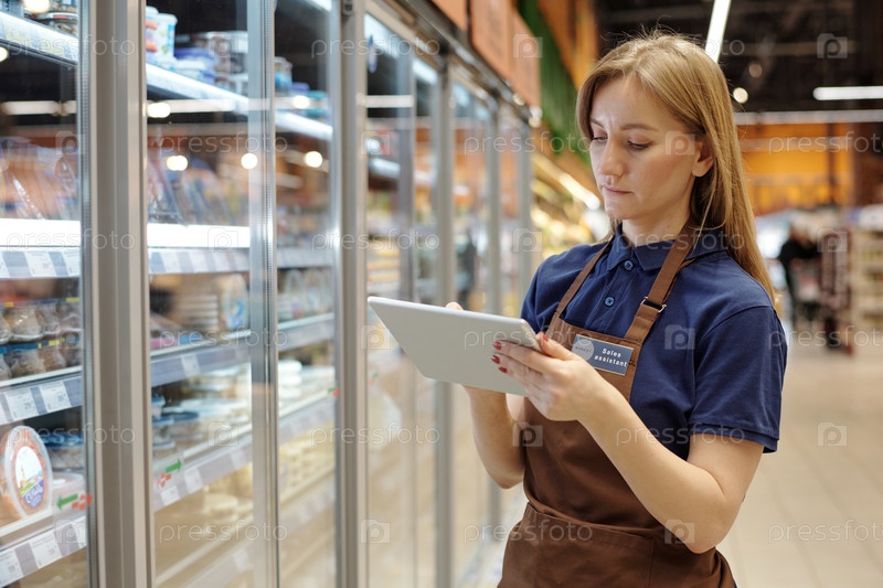 Работник супермаркета использует планшет