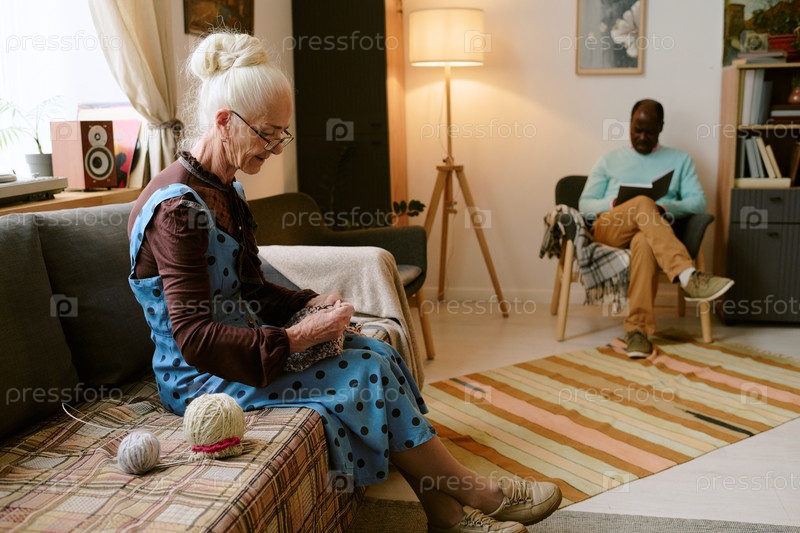 Старшая женщина вяжет на диване