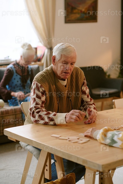 Пожилой мужчина играет в домино с компаньоном