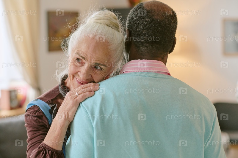 Улыбающаяся элегантная женщина обнимает неузнаваемого мужчину