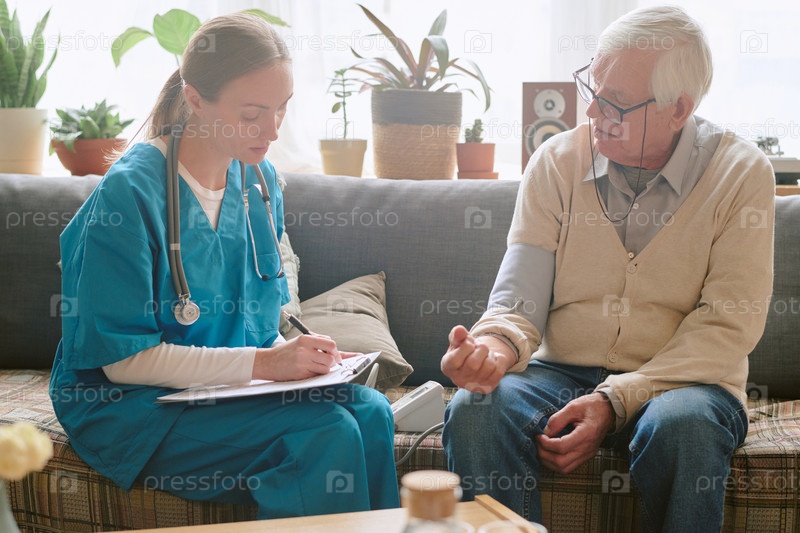 Женщина, записывающая имя таблеток рядом со старшим мужчиной