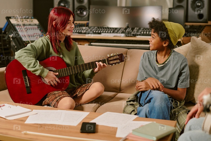 Лидер группы и гитарист разговаривают в студии