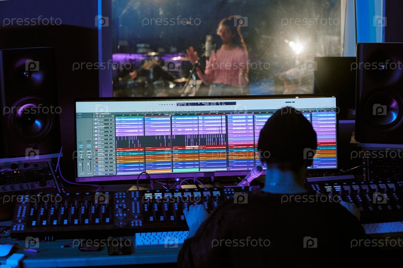 Звуковой инженер сидит за столом и смотрит на огромный монитор